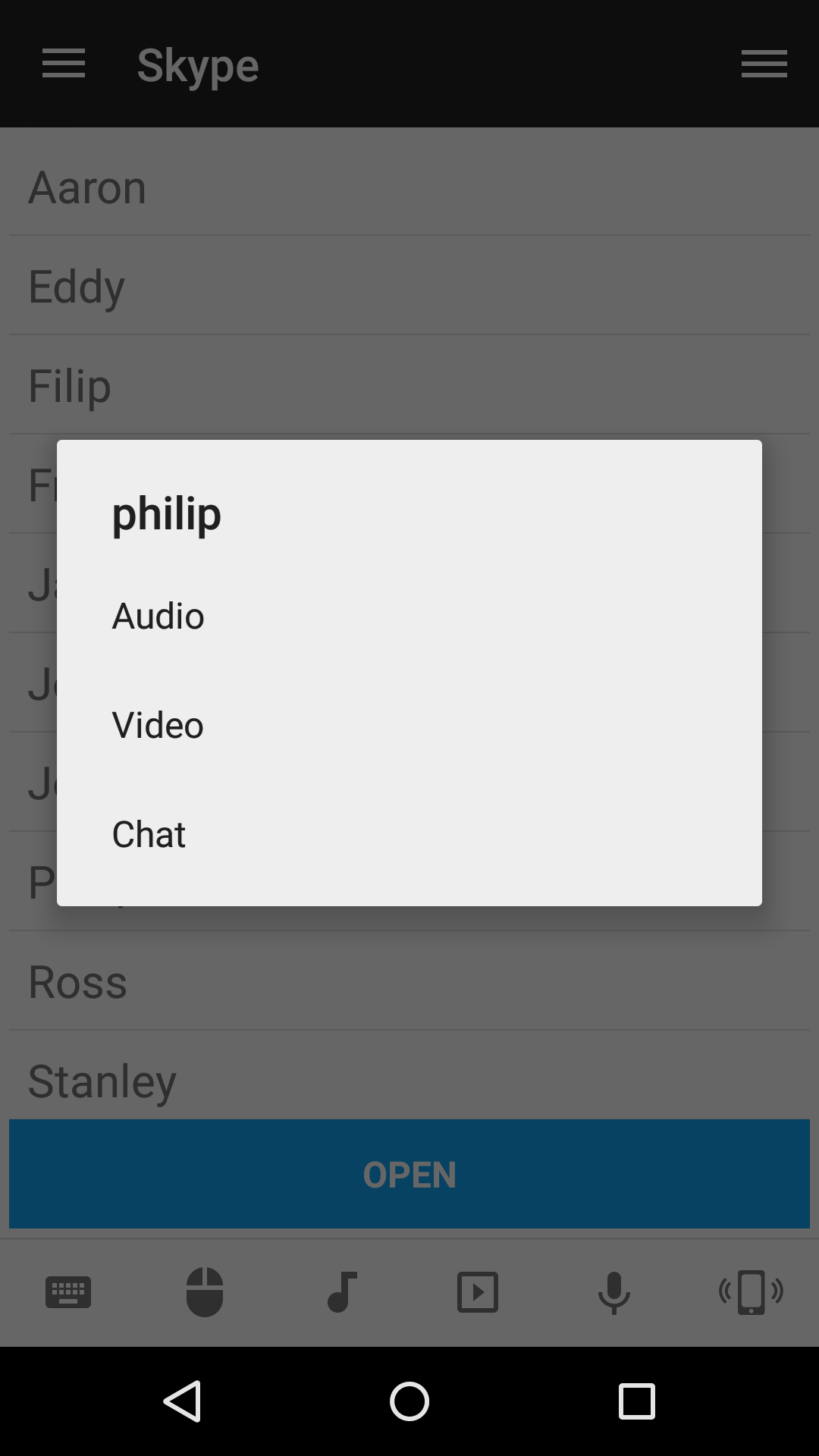 Open Skype, but also lets you start calls (audio or video) or open a chat.